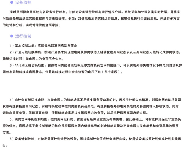 微電網(wǎng)能量管理控制系統(tǒng)軟件體系結構由操作系統(tǒng)、支撐平臺、應用功能共三個層次組成,應用功能又分為基本應用功能和高級管理功能兩個部分,如下圖所示。操作系統(tǒng)支持跨平臺,支撐平臺包含數(shù)據(jù)采集管理、數(shù)據(jù)庫管理、網(wǎng)絡通信管理、圖形管理、報表管理、權限管理、報警管理、計算統(tǒng)計等模塊?;緫霉δ馨⊿CADA處理、監(jiān)控功能、統(tǒng)計分析功能、安全WEB數(shù)據(jù)發(fā)布等。高級管理功能包括全局能量管理目標制定等。