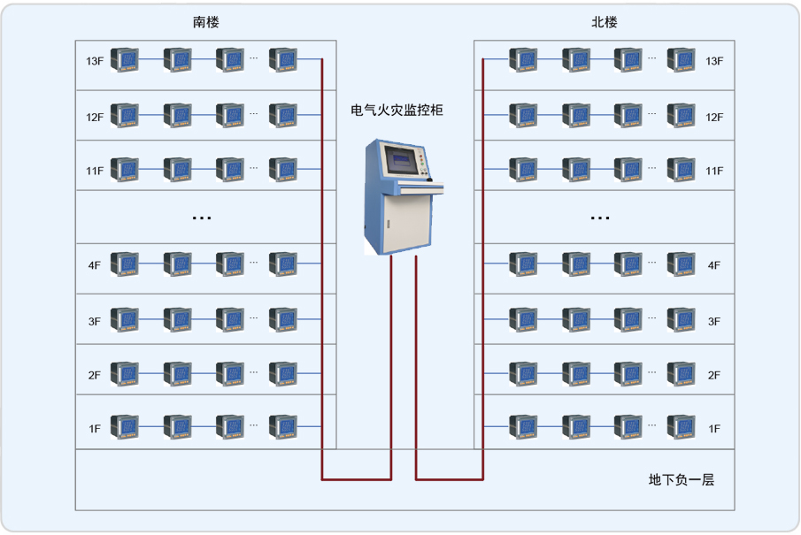 站控管理層針對電氣火災監(jiān)控系統(tǒng)的管理人員,是人機交互的直接窗口,也是系統(tǒng)的上層部分。主要由系統(tǒng)軟件和必要的硬件設備,如監(jiān)控主機、顯示器、UPS電源等組成。監(jiān)測系統(tǒng)軟件具有良好的人機交互界面,對現場各類數據信息計算、分析、處理,并以圖形、數顯、聲音、指示燈等方式反應現場運情況。