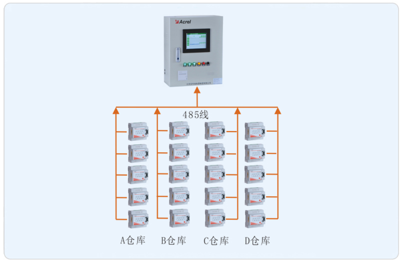系統(tǒng)采用安科瑞消防電源監(jiān)控系統(tǒng),該系統(tǒng)主要采用分層分布式網(wǎng)絡(luò)結(jié)構(gòu),系統(tǒng)結(jié)構(gòu)為:站控管理層、網(wǎng)絡(luò)通訊層和現(xiàn)場設(shè)備層。其中廣陳第三方電子商務(wù)平臺(tái)托管產(chǎn)業(yè)基地現(xiàn)場設(shè)備分布為A、B、C、D倉庫以及綜合辦公用房消防配電回路。該系統(tǒng)監(jiān)控所有消防配電柜內(nèi)消防回路雙電源的實(shí)時(shí)運(yùn)行狀態(tài),如有異常會(huì)后臺(tái)報(bào)警。所有監(jiān)測模塊通過485總線鋪設(shè)至消防控制室,消防電源監(jiān)控主機(jī)從而完成對監(jiān)測模塊的采集并監(jiān)控。