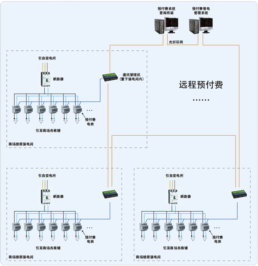 恒通順達(dá)廣場需要對商業(yè)部分85個(gè)商鋪?zhàn)鈶魧?shí)現(xiàn)預(yù)付費(fèi):先交費(fèi),后用電。為了方便業(yè)主充值和物業(yè)管理,要求使用遠(yuǎn)程預(yù)付費(fèi)方式,租戶在財(cái)務(wù)繳納電費(fèi),財(cái)務(wù)通過系統(tǒng)直接對儀表進(jìn)行遠(yuǎn)程充值,不需要租戶和物業(yè)接觸預(yù)付費(fèi)儀表,既保證人身安全,也保證系統(tǒng)安全。