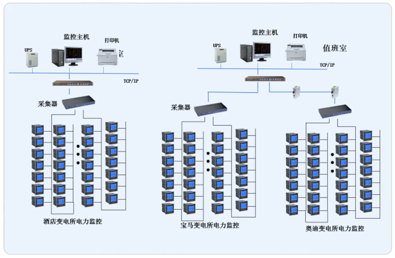 本項目根據(jù)管理區(qū)域設(shè)置兩套Acrel-2000型電力監(jiān)控系統(tǒng),系統(tǒng)采用網(wǎng)絡(luò)分布式結(jié)構(gòu),其中寶馬奧迪主機設(shè)置在地下配電值班室,酒店設(shè)置在一樓值班室。所有配電回路均配備安科瑞電力儀表PZ系列。該項目實現(xiàn)了3個變電所內(nèi)電力系統(tǒng)的智能管理。所有監(jiān)控設(shè)備均通過屏蔽雙絞線至各自配電室內(nèi)的通訊管理機,從而實現(xiàn)遠程監(jiān)控。