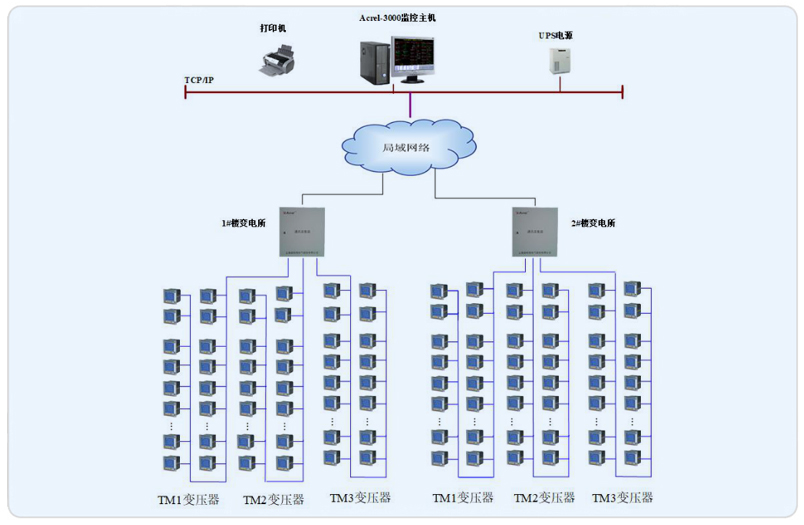 廣饒尚能時代項目引入兩路10KV市電,在1#樓設(shè)10KV高壓配電室。1#樓有3臺10KV/0.4KV變壓器:TM1容量為500KVA,TM2容量為500KVA,TM3容量為1000KVA;2#樓有3臺10KV/0.4KV變壓器:TM1容量為630KVA,TM2容量為500KVA,TM3容量為1000KVA。后配出至各樓層配電箱,用于空調(diào)、照明、動力、特殊等用電。安科瑞電氣股份有限公司于2017年7月承接了廣饒尚能時代項目電能管理系統(tǒng)的設(shè)計與實施,旨在通過該系統(tǒng)實現(xiàn)廣饒尚能時代項目用電的集中管理和檢測,實現(xiàn)遠程智能化配電。