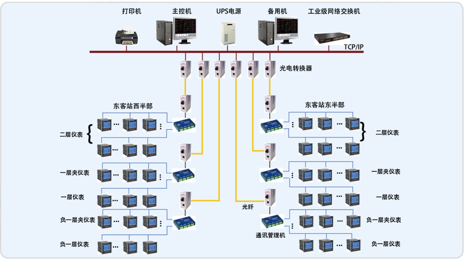 成都東客站電能管理系統(tǒng)采用雙機(jī)服務(wù),位于東客站一層西南角值班中心,同時(shí)該系統(tǒng)配有6臺管理機(jī),根據(jù)現(xiàn)場儀表的分布范圍,合理的分配6臺管理機(jī)的管理范圍;為保障數(shù)據(jù)傳輸?shù)膶?shí)時(shí)性和穩(wěn)定性,均采用光纖進(jìn)行數(shù)據(jù)上傳。在值班室對管理機(jī)上傳的數(shù)據(jù)進(jìn)行多樣式表現(xiàn)方式,畫面比較形象直觀;系統(tǒng)同時(shí)具備向BA系統(tǒng)轉(zhuǎn)發(fā)數(shù)據(jù)的功能。