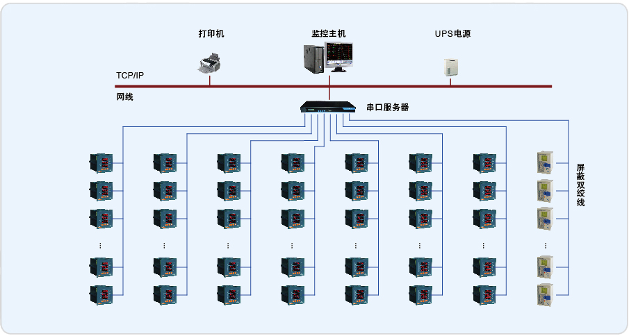 整個(gè)系統(tǒng)采用分布式結(jié)構(gòu),網(wǎng)球中心整個(gè)配電系統(tǒng)分為高低壓兩個(gè)部分,分別位于高壓變電所及低壓變電所,電力監(jiān)控系統(tǒng)位于配電室旁邊的電力監(jiān)控值班室。其中高壓配電室共計(jì)5個(gè)回路,分別為10KV進(jìn)線1、10KV進(jìn)線2、1#變壓器出線、2#變壓器出線及聯(lián)絡(luò);低壓變電所共計(jì)145個(gè)回路,分別采用ACR220E及ACR220ELH,其中ACR220ELH安裝于低壓進(jìn)線及發(fā)電機(jī)進(jìn)線中。本系統(tǒng)網(wǎng)球中心電力監(jiān)控?cái)?shù)據(jù)均通過奧體中心內(nèi)部局域網(wǎng),將數(shù)據(jù)通過Modbus TCP的方式上傳至奧體中心數(shù)據(jù)中心,同時(shí)在廣州市10樓設(shè)置電力監(jiān)控系統(tǒng)工作站,數(shù)據(jù)通過網(wǎng)絡(luò)公司局域網(wǎng),通過廣東省104規(guī)約傳輸至調(diào)度中心。