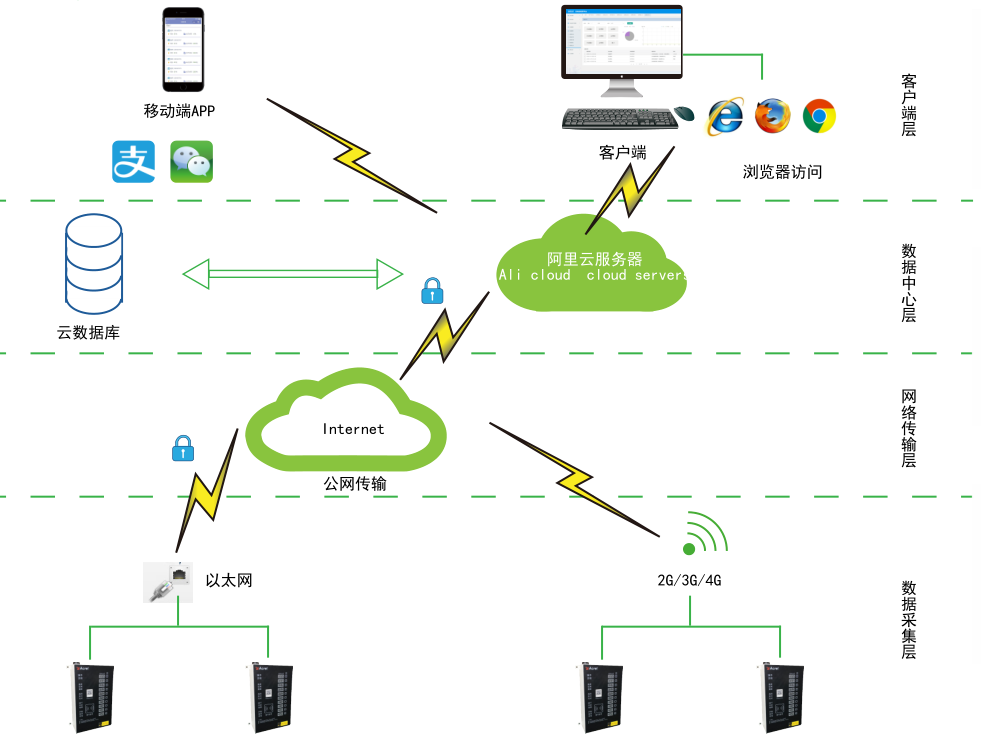 安科瑞電瓶車充電樁通過GPRS模塊與云端進(jìn)行通信和數(shù)據(jù)交互。系統(tǒng)能夠?qū)﹄娖寇嚦潆姌兜娜粘顟B(tài)、充電過程進(jìn)行監(jiān)控;實(shí)現(xiàn)充電支付對接:支持投幣、刷卡、微信支付等多種支付方式,保證支付交易過程的完整性,對充電過程中的異常情況進(jìn)行有效預(yù)警;實(shí)現(xiàn)對下游站級平臺的清算、對賬功能。
