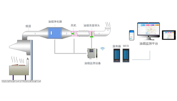 凈化器和風(fēng)機(jī)配合對油煙進(jìn)行凈化處理,同時(shí)對凈化設(shè)備的電流進(jìn)行監(jiān)測