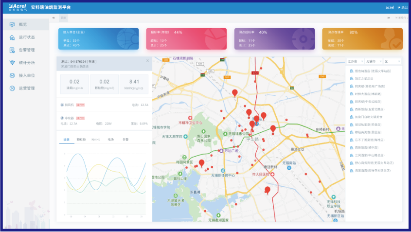 平臺GIS地圖采集餐飲油煙處理設(shè)備運(yùn)行狀態(tài)和油煙排放的濃度數(shù)據(jù),自動對超標(biāo)排放及異常企業(yè)進(jìn)行提示預(yù)警,監(jiān)管部門可迅速進(jìn)行處理,督促餐飲企業(yè)整改設(shè)備,并定期清洗、維護(hù),實(shí)現(xiàn)減排環(huán)保,不擾民等目的。