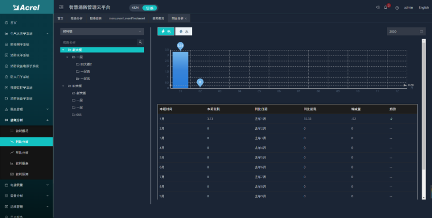 能耗分析功能包括了能耗概況、能耗同比、能耗環(huán)比、能耗報表和能耗預(yù)測等五個模塊??梢圆榭吹卿浻脩粝碌乃许?xiàng)目 的能耗統(tǒng)計、同環(huán)比和報表,且按日、周、月等維度進(jìn)行能耗預(yù)測分析。
