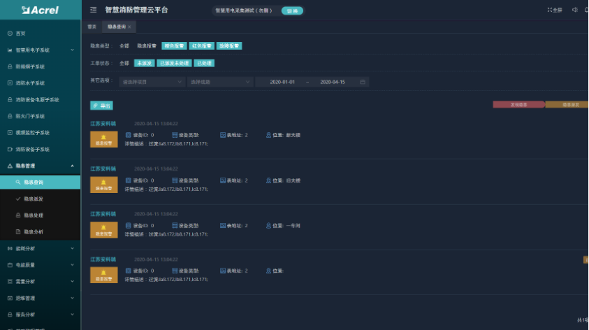 隱患管理功能包括了隱患查詢、隱患派發(fā)、隱患處理和隱患分析四個模塊??梢圆榭吹卿浻脩粝碌乃许?xiàng)目的隱患信息,并進(jìn)行派發(fā)和處理操作,且對所有隱患進(jìn)行統(tǒng)計分析。